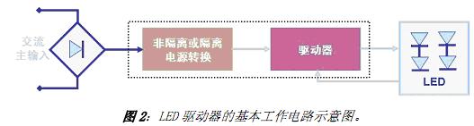 LED 的排列方式及LED 光源的規(guī)范決定著基本的驅(qū)動器要求。LED 驅(qū)動器的主要功能就是在一定的工作條件范圍下限制流過LED 的電流, 而無論輸入及輸出電壓如何變化。LED驅(qū)動器基本的工作電路示意圖如圖2 所示,其中所謂的“隔離”表示交流線路電壓與LED(即輸入與輸出)之間沒有物理上的電氣連接,最常用的是采用變壓器來電氣隔離,而“非隔離”則沒有采用高頻變壓器來電氣隔離。