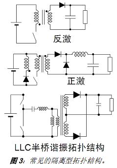電路中通常加入了變壓器的隔離型AC-DC 電源轉(zhuǎn)換包含反激、正激及半橋等拓撲結(jié)構(gòu),參見圖3,其中反激拓撲結(jié)構(gòu)是功率小于30 W 的中低功率應(yīng)用的標準選擇,而半橋結(jié)構(gòu)則最適合于提供更高能效/功率密度。就隔離結(jié)構(gòu)中的變壓器而言,其尺寸的大小與開關(guān)頻率有關(guān),且多數(shù)隔離型 LED 驅(qū)動器基本上采用“電子”變壓器。