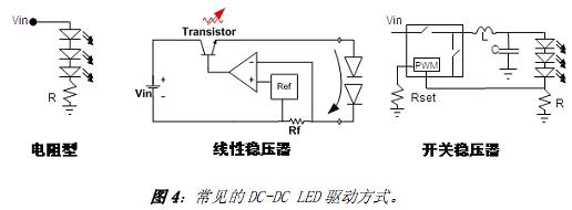采用 DC-DC 電源的LED 照明應(yīng)用中,可以采用的LED 驅(qū)動方式有電阻型、線性穩(wěn)壓器及開關(guān)穩(wěn)壓器等,基本的應(yīng)用示意圖參見圖 4。電阻型驅(qū)動方式中,調(diào)整與LED 串聯(lián)的電流檢測電阻即可控制LED 的正向電流,這種驅(qū)動方式易于設(shè)計、成本低,且沒有電磁兼容(EMC)問題,劣勢是依賴于電壓、需要篩選(binning) LED,且能效較低。