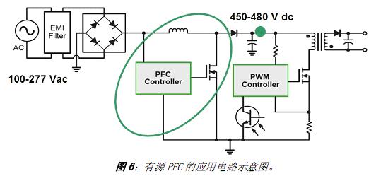 有源 PFC(見圖6)通常是作為一個專門的電源轉(zhuǎn)換段增加到電路中來改變輸入電流波形。有源PFC 通常提供升壓,交流100 至277 Vac的寬輸入范圍下,PFC 輸出電壓范圍達直流450 至480 Vdc。如果恰當?shù)卦O(shè)計PFC 段,可以提供91%到95%的高能效。但增加了有源PFC,仍然需要專門的DC-DC 轉(zhuǎn)換來提供電流穩(wěn)流。