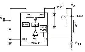 如果直接用電阻RFB來檢測IF,這樣在精度上就可以滿足要求,但是在電阻上將會產(chǎn)生額外的功耗。降低反饋電壓VFB,在同樣的檢測電流IF(圖.2)的情況下可以降低檢測電阻的阻值,這樣就可以使功耗降到最低。最新的LED驅(qū)動(dòng)大多數(shù)提供的參考電壓(反饋電壓)在50-200毫伏之間。