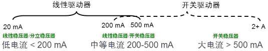 市場上典型的LED驅(qū)動器包括兩類,即線性驅(qū)動器和開關(guān)驅(qū)動器;大概的適用范圍見圖1。如電流大于500mA的大電流應(yīng)用采用開關(guān)穩(wěn)壓器,因?yàn)榫€性驅(qū)動器限于自身結(jié)構(gòu)原因,無法提供這樣大的電流;而在電流低于200mA的低電流應(yīng)用中,通常采用線性穩(wěn)壓器或分離穩(wěn)壓器;而在200至500mA的中等電流應(yīng)用中,既可以采用線性穩(wěn)壓器,也可以采用開關(guān)穩(wěn)壓器。