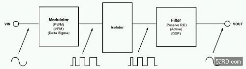 舉例來(lái)說(shuō),典型音頻系統(tǒng)的DSP必須從光碟讀取數(shù)字內(nèi)容,然后處理這些資訊以便加入適當(dāng)音效(2、4或8聲道音頻),最后再將處理完成的位元串流送到音頻數(shù)字模擬轉(zhuǎn)換器(圖1的濾波器/解調(diào)器)。數(shù)字模擬轉(zhuǎn)換器輸出的模擬信號(hào)接著會(huì)送到揚(yáng)聲器,重新產(chǎn)生使用者想聽(tīng)的聲音。如前所述,許多音頻系統(tǒng)(尤其是24位元高傳真系統(tǒng))喜歡將DSP電路的接地面與電源(揚(yáng)聲器)接地面隔離。這項(xiàng)技術(shù)是用來(lái)將接地回路的拾取信號(hào)減至最少,進(jìn)而降低背景噪音和嗡嗡聲。