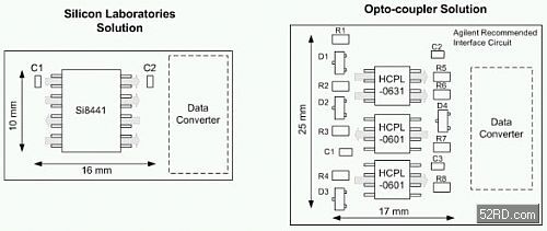 圖5:光耦合器與數(shù)字隔離元件的布局比較