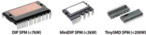 為了克服以上約束,最好采用智能功率模塊(intelligentpowermodule(IPM),也稱為SmartPowerModule(SPM®))。圖2所示為一個(gè)典型的全封閉模塊,它包含一個(gè)完整的三相電壓源變頻器,以及相應(yīng)的柵極驅(qū)動(dòng)器和保護(hù)電路。采用這種模塊比分立元件方案節(jié)省電路板空間多達(dá)50%。尤其是這種模塊需要的外接部件極少,在設(shè)計(jì)上就考慮了EMC的要求。其峰值和平均EMC干擾強(qiáng)度比傳統(tǒng)設(shè)計(jì)低很多。
