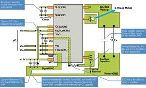 與電壓源變頻器的分立元件方案類似,采用智能功率模塊時(shí)也要注意外部元件的布局安排。圖3所示為針對(duì)Motion-SPMTM應(yīng)用的一些建議。由于電壓源變頻器的開關(guān)速率很快,信號(hào)接地和功率接地必須分開。兩種接地在15VVcc電容處互接。Vcc電容和功率接地之間的通道要狹窄,以去除耦合。為防止電涌造成破壞,引腳P與功率接地之間應(yīng)當(dāng)有一個(gè)低電感電容。另外,由于電壓源變頻器和馬達(dá)之間的長(zhǎng)引線會(huì)造成高壓反射,因此一些SPM產(chǎn)品配備了外接?xùn)艠O電阻來(lái)調(diào)節(jié)開關(guān)速率和最大限度地減少反射。