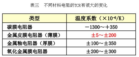 目前TCR小的電阻器只有薄膜電阻,一般情況下,碳膜與陶瓷電阻器TCR為負(fù),對于低TCR設(shè)計(jì),首選推薦10ppm。不同材料電阻的TCR有很大的變化,大致范圍可以從下表看出: