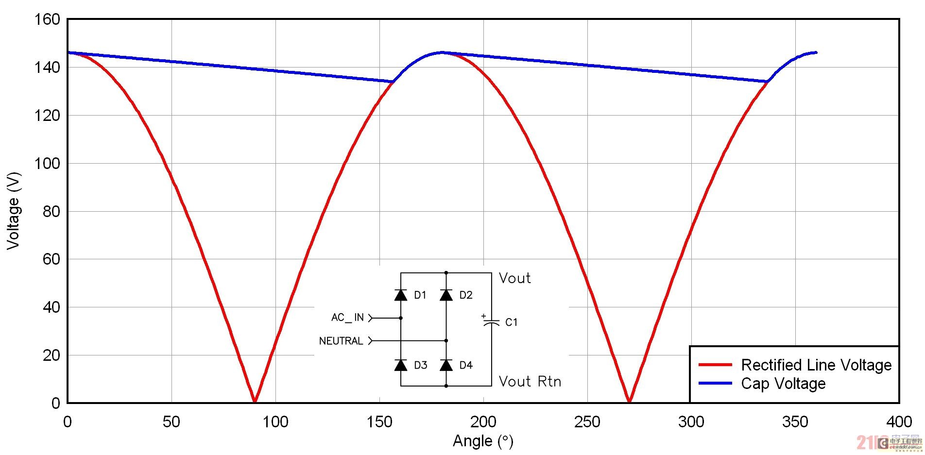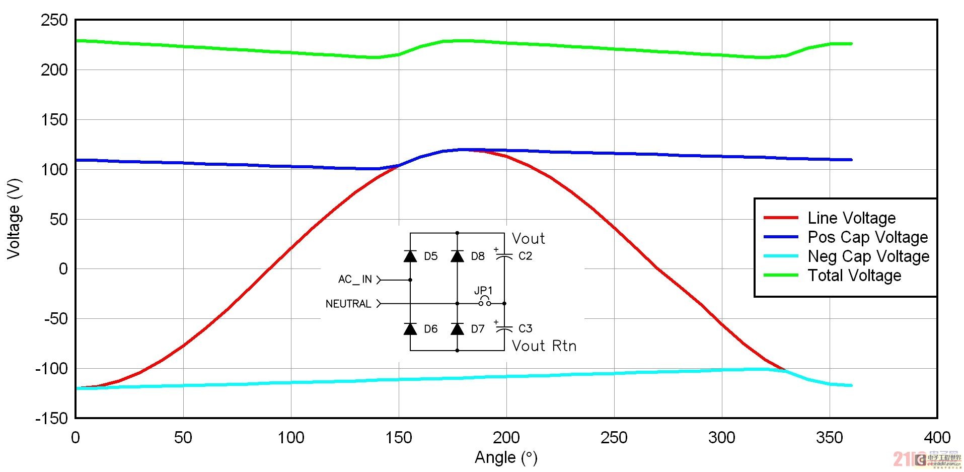 圖 2 描述了一種倍壓器整流配置結構,許多 115/230 VAC 應用都使用了這種結構。如果您有一個 230 VAC 應用,則您的輸入級需要處理最大輸入電壓(265 VAC)乘以峰值因數(shù)這么大的電壓,其接近 400 伏。在與一個 115 VAC 輸入一起使用時,倍壓器將經(jīng)過整流的電壓,增壓至接近 230 VAC 輸入電平。我們可以專為 230 VAC 線壓設計一個電源,以此來減小電源工作的整流后電壓范圍。我們通常使用一個跳線或者開關,來實現(xiàn)不同整流器配置之間的切換。這種方法的唯一缺點是偶爾出現(xiàn)人為倍增 230 VAC 輸入的情況,從而對電源造成嚴重破壞。圖 2 顯示了倍壓器電路的一些波形。電容之間不帶電。兩個整流器交替對每個電容施加輸入電壓。一個周期中,每個電容都被充電至峰值線壓,這樣它們每個都有一個線頻率紋波部分。由于電容為異相位充電,因此其和的紋波頻率為線頻率的兩倍。