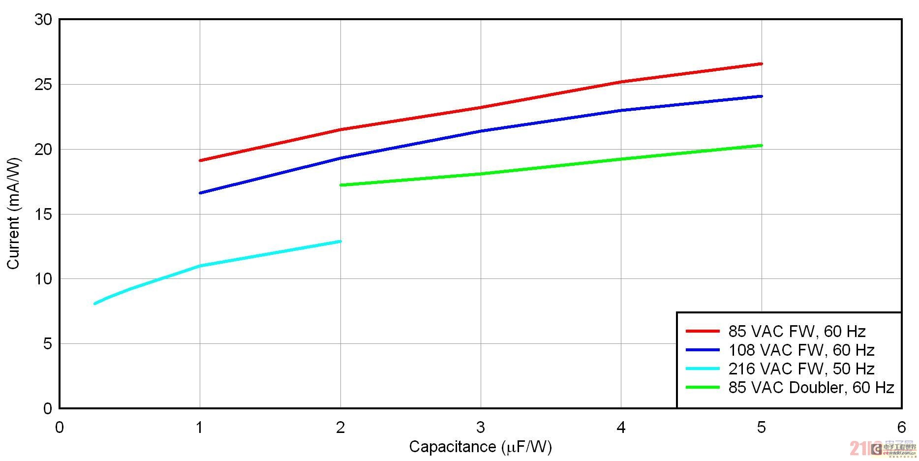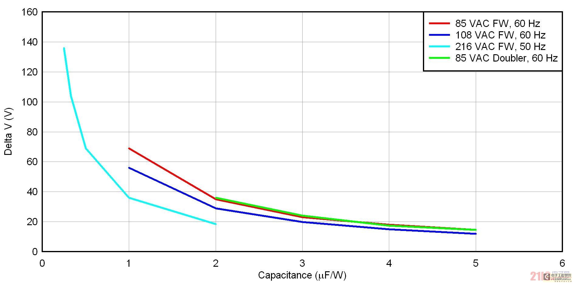 [page]圖 3 顯示了四種整流器/輸入電壓方法的 uF/W 標準化壓降。共有三種全波橋接方法,適用于低線壓美國(108 VAC/60 Hz)、低線壓日本(85 VAC/50 Hz)和低線壓歐洲(216 VAC/50 Hz)。另外,還有一個低線壓日本的倍壓器。就全波橋而言,標準化過程只需將電容除以功率。在倍壓器中,標準化方法是將兩個串聯(lián)電容之一的電容除以功率。要想使用該曲線圖,請首先確定您的整流器配置結構,并選擇一個可以接受的壓降。之后,您只需讀取輸入電容的 uF/W 便可。最后,通過乘以您的功率,便可去標準化。