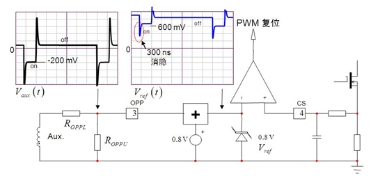 如圖 1 所示,電路中的光耦合器斷路或 TL431 分壓器網(wǎng)絡(luò)遭受嚴(yán)重漂移影響(或其某個電阻丟失或出現(xiàn)錯誤值)時,輸出電壓就可能超出規(guī)定的限制值,這就是過壓條件。大多數(shù)情況下,過壓條件可能對下行負載有害,適配器這時必須完全關(guān)斷。NCP1250/1 在 OPP 引腳上也集成了 3 V 參考比較器,這比較器可用于多種功能,如 OVP。如果這 OPP 引腳電壓連續(xù)四次超過 3 V,就使控制器 IC 閂鎖保護。