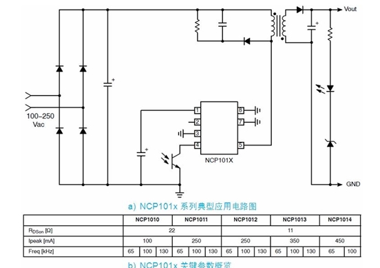 以 NCP101x 為例,這系列器件集成了固定頻率電流模式控制器及典型導(dǎo)通阻抗為 11 或 22 ? 的 700 V MOSFET,提供構(gòu)建強固及低成本開關(guān)電源所需的全部特性,包括軟啟動、頻率抖動、短路保護、跳周期、最大峰值電流設(shè)定點及動態(tài)自供電(不需要輔助繞 組)等。在正常負(fù)載工作期間,NCP101x 以 65、100 及 130 kHz 中的某一頻率開關(guān);而當(dāng)電流設(shè)定點降到低于某個給定值(如輸出功率需求消失)時,NCP101x 自動進入所謂的跳周期模式(在此模式下跳除不需要的開關(guān)周期),從而提供極佳的輕載能效。由于進入跳周期模式通常發(fā)生在最大峰值電流的 1/4 時,故沒有可聽噪聲產(chǎn)生。因此,待機能耗降至最低,且沒有可聽噪聲產(chǎn)生。NCP101x 典型應(yīng)用電路及不同型號的關(guān)鍵參數(shù)參見圖 2。