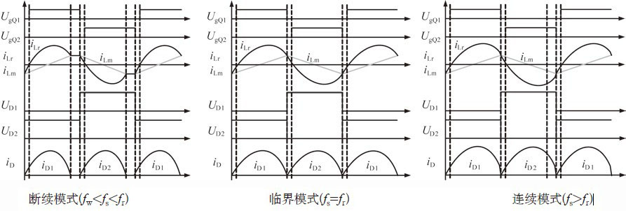 諧振網(wǎng)絡(luò)由諧振電感L r、諧振電容C r、激磁電感L m組成。圖2為其主要的理想工作波形,根據(jù)工作頻率的不同,我們可以把它分為三個(gè)模式,即斷續(xù)模式(fw<fs<fr)、臨界模式(fs=fr)和連續(xù)模式(fs>fr),其中fw為第一諧振頻率,fr為第二諧振頻率,fs為開(kāi)關(guān)管工作頻率。