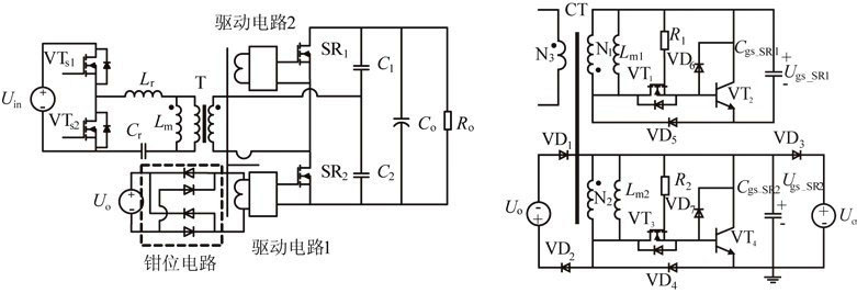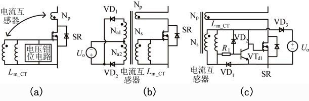 圖7為幾種典型的電流型驅(qū)動(dòng)方案。傳統(tǒng)的電流型驅(qū)動(dòng)方案如圖7(a)所示,整個(gè)驅(qū)動(dòng)電路包括一個(gè)電流互感器(CT)和一個(gè)電壓箝位電路。電路通過(guò)電流互感器對(duì)電流信號(hào)進(jìn)行采樣,并給同步管提供相應(yīng)的驅(qū)動(dòng)信號(hào),多余的驅(qū)動(dòng)能量被箝位電路消耗。該驅(qū)動(dòng)電路比較簡(jiǎn)單,但是有較大的驅(qū)動(dòng)損耗,限制了變流器效率的提高。因此有文獻(xiàn)提出了具有剩余驅(qū)動(dòng)能量回饋功能的電流型驅(qū)動(dòng)方案,如圖7(b)所示。該驅(qū)動(dòng)電路中多余的驅(qū)動(dòng)能量能通過(guò)輔助繞組回饋到主電路,從而可以較大的減少驅(qū)動(dòng)電路的損耗,并簡(jiǎn)化電流互感器的設(shè)計(jì),但是多繞組的電流互感器大大增加了生產(chǎn)成本。另有文獻(xiàn)提出了一種更為簡(jiǎn)單的電流型驅(qū)動(dòng)方案,如圖7(c)所示。該方案的電流互感器只需一個(gè)副邊繞組,同時(shí)也具有剩余驅(qū)動(dòng)能量回饋的功能,更加有利于實(shí)際的生產(chǎn)應(yīng)用。通過(guò)三極管VTd1,它可以準(zhǔn)確地檢測(cè)同步整流管應(yīng)該關(guān)斷的時(shí)刻,從而保證了同步整流電路的可靠性。