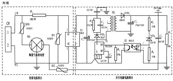 陶瓷氣體放電管的通流容量根據(jù)要求的通流容量選擇,電路采用3RM470L-7.5-L,通流量為5000A。線繞電阻R1起限流分壓作用;貼片整流模塊為開關(guān)電源電路前端整流作用,C1為高壓濾波電容,Y1為去耦電容,電阻R2和電容C2及VD2組成開關(guān)電源芯片MOS管的吸收鉗位電路,保護芯片,開關(guān)電源芯片采用PI公司的TNY27系列,TR1為高頻變壓器,VD3、C3構(gòu)成高頻變壓器次級濾波,U2、VD4、R3、R4、R5構(gòu)成開關(guān)電源電路的反饋電路,可將變壓器次級輸出電壓穩(wěn)定在設(shè)計值,此防雷抗浪涌電路在實際使用中取得了較好的效果。