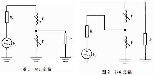 變壓器:主要實(shí)現(xiàn)低頻段,隨著工作頻段的升高,這類電路的應(yīng)用越來越少。傳輸線變壓器可以實(shí)現(xiàn)寬帶阻抗變換,實(shí)現(xiàn)4:1和1:4工作模式如圖1和圖2所示。可以實(shí)現(xiàn)平衡和非平衡的變換,尤其在電視機(jī)外接天線到同軸線輸入端口的連接中得到應(yīng)用。