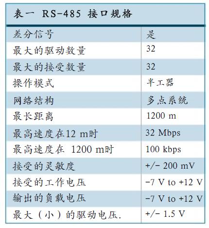 表一詳細(xì)的說明了RS-485 接口的規(guī)范。主要的參數(shù)包括-7V 到+12V 的工作電壓,32Mbps 的數(shù)據(jù)傳輸速度已經(jīng)1200 米的傳輸距離等。一個(gè)完全兼容的RS-485 接口必須符合 IEC61000-4-2(靜電),IEC61000-4-4(群脈沖)和 IEC61000-4-5 (浪涌)標(biāo)準(zhǔn)。