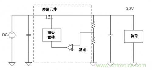 圖1. 線性穩(wěn)壓器框圖。注意,旁路元件將在其自身和負(fù)荷之間形成一個(gè)分壓器,起到耗散功率的作用。