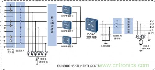 光伏逆變器由升壓回路和逆變橋式回路構(gòu)成,升壓回路主要用于將直流電壓升壓至逆變器輸出所需直流電壓,逆變橋式回路主要用于將升壓后的直流電壓轉(zhuǎn)換為固定頻率的交流電壓。因此,經(jīng)升壓回路和逆變橋式回路完成將直流電轉(zhuǎn)換為交流點(diǎn)的功能。