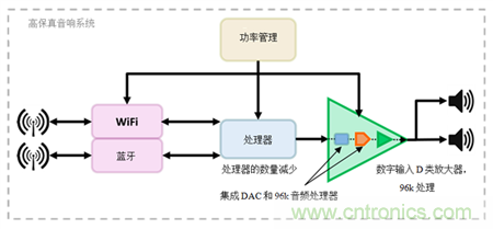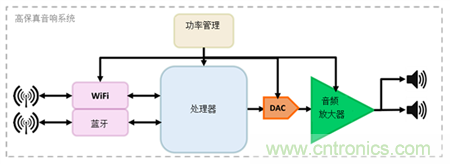 處理器執(zhí)行各種音頻處理功能,如解碼和信號(hào)均衡,同時(shí)也處理Wi-Fi和/或藍(lán)牙通信軟件堆棧。過(guò)去,CD品質(zhì)的采樣頻率可能已足夠。但是今天的高保真音頻系統(tǒng)對(duì)信號(hào)鏈中的處理器提出了其它要求,因?yàn)楦弑U嬉糍|(zhì)要求在24位音樂(lè)信號(hào)流中提供48kHz至192kHz范圍內(nèi)的采樣率。