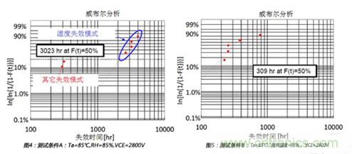 3.3kV高壓IGBT的溫濕反偏試驗(yàn)是在以下三個條件下測試:測試條件A(Ta=85℃,相對濕度=85%, VCE=2800V),測試條件B(Ta=85℃,相對濕度=95%, VCE=2800V),測試條件C(Ta=85℃,相對濕度=95%, VCE=2000V),測試結(jié)果如圖4,圖5和圖6所示。