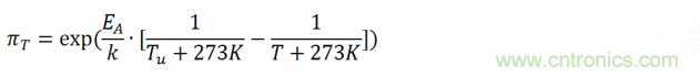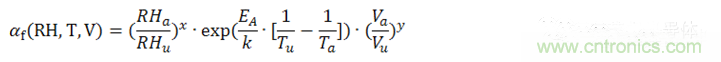 公式中,αf為測試的加速因子,也就是加速(后綴為a)測試條件下MTTF(Mean Time To Failures,平均無故障時間)與參考(后綴為u)測試條件下MTTF之比。EA是活化能,在0.79eV和0.95eV之間,k為玻爾茲曼常數(shù)。指數(shù)x為相對濕度的影響,指數(shù)y為電壓的影響,都是經(jīng)驗(yàn)數(shù)據(jù),但是必須通過實(shí)際評估來確認(rèn)。我們把此加速模型擴(kuò)展到壽命預(yù)估模型中。