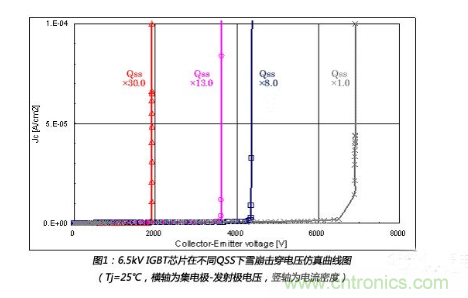 一般來說,擊穿電壓會隨著IGBT芯片邊緣電荷量QSS的增加而降低。圖1為6.5kV 高壓IGBT芯片的擊穿電壓隨著QSS變化的曲線圖。高濕度工況下的失效機(jī)理如下所述。