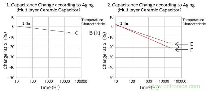 高誘電系的積層陶瓷電容器的靜電容量,以經(jīng)過125℃以上的熱處理24小時后的值作為基準,與時間成對數(shù)關(guān)系直線性下降。請參考如下村田制品靜電容量老化特性的代表例子。