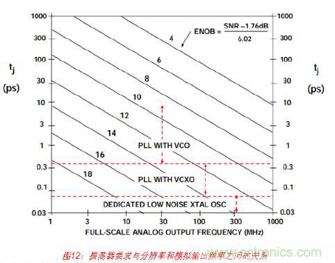 圖12顯示的是與圖10相同的數(shù)據(jù),但其中針對各種分辨率要求繪制出與模擬輸出頻率成 函數(shù)關(guān)系的最大允許抖動。根據(jù)最大輸出頻率和ENOB中所需分辨率來選擇采樣時鐘發(fā)生 器類型,應(yīng)以此圖片作為大概準(zhǔn)則。具有標(biāo)準(zhǔn)VCO的PLL方法就是產(chǎn)生采樣時鐘的一種 不錯方式,其中均方根(RMS)抖動要求大約為1 ps或以上。不過,亞皮秒抖動要求采用基 于VCXO的PLL或?qū)S玫驮肼暰w振蕩器。“教程MT-008”介紹了如何將振蕩器相位噪聲轉(zhuǎn) 換成抖動。