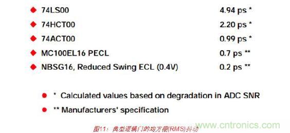 為了顯示這些抖動值的重要性,請考慮與一組邏輯門相關(guān)的均方根(RMS)抖動典型值,如 圖11所示。74LS00、74HCT00和74ACT00的值都是采用參考文獻(xiàn)1第5章所述的方法以高 性能ADC(孔徑抖動小于0.2-ps rms)測得的,其中抖動是從因多個相同門串聯(lián)而導(dǎo)致的FFT SNR降低計算得出的。然后,通過除以串聯(lián)門總數(shù)的平方根,便可計算出單個門所造成 的抖動。制造商給出了MC100EL16和NBSG16的抖動數(shù)據(jù)。