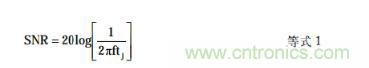 ADC寬帶孔徑抖動tj、轉(zhuǎn)換器SNR和滿量程正弦波模擬輸入頻率 f之間的關(guān)系如下: