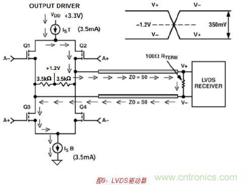 當(dāng)并行數(shù)據(jù)速率超過約100 MSPS時,由于不太可能會產(chǎn)生CMOS邏輯電平以上的瞬變干 擾,因此通常使用低電平電流模式差分邏輯(PECL、較低級別的PECL或LVDS等)(見圖 9)。這樣可幫助最大程度地減少因碼相關(guān)毛刺而產(chǎn)生的失真。例如,AD9734/AD9735/ AD9736 DAC系列采用1.2 GSPS并接受LVDS輸入邏輯電平。片上包含特殊電路,以確保 輸入數(shù)據(jù)相對于DAC時鐘具有正確時序