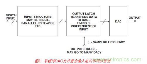 DAC輸入結(jié)構(gòu)存在無數(shù)變化形式,本文將不一一介紹,但幾乎所有都稱為“雙緩沖”。栓 緩沖DAC具有兩組鎖存器。數(shù)據(jù)最初鎖存在第一級中,然后傳輸?shù)降诙?,如圖8所示。 這種配置非常有用,具體有以下幾種原因。
