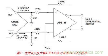 如果要求從電流輸出DAC獲得緩沖差分電壓輸出,則可以使用AD813x系列差分放大器, 如圖7所示。