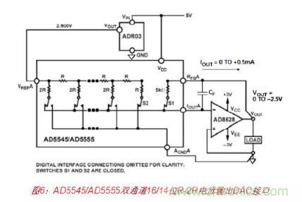 基于R-2R的電流輸出DAC的輸出阻抗與碼字有關(guān),因此其輸出必須驅(qū)動運算放大器的虛 擬地,以便維持線性。16/14位DAC AD5545/AD5555都是此種架構(gòu)的很好范例。圖6所示為 一種合適的接口電路,其中ADR03用作2.5 V基準(zhǔn)電壓源,而AD8628斬波穩(wěn)定運算放大器 用作輸出I/V轉(zhuǎn)換器。