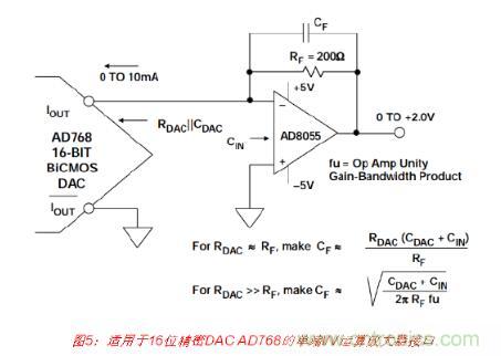 通過使用單個運算放大器作為I/V轉(zhuǎn)換器,便可輕松執(zhí)行單端電流電壓轉(zhuǎn)換,如圖5所 示。AD768的10 mA滿量程DAC電流輸出可以在200 Ω RF電阻上產(chǎn)生0至+2 V的輸出電 壓。