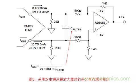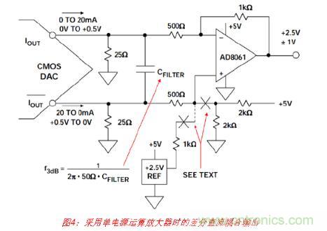 但是應(yīng)注意,與差分工作模式相比,以這種方式使用DAC的單端輸出時,共模抑制性能將 下降,且2階失真產(chǎn)物將增加。