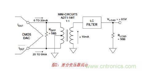 變壓器不僅用于將差分輸出轉(zhuǎn)換成單端信號,而且還將DAC的輸出與LC濾波器的抗性負(fù) 載隔離開來,因而可以改善整體失真性能。