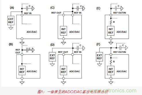 各種各樣的ADC和DAC以各種各樣的方式支持使用外部基準(zhǔn)電壓源來替代內(nèi)部基準(zhǔn)電壓源。圖1所示為一些常見配置(但顯然并不是全部)。