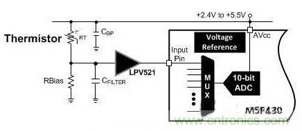從技術(shù)上講,熱敏電阻是一種電阻器,它的電阻值隨溫度的變化而變化。如圖1中所示,需要一個偏置電路和少數(shù)幾個外部組件,在這里,偏置電阻器和熱敏電阻組成了一個分壓器,并且被接到一個可選運算放大器上,這個運算放大器與微控制器 (MCU) 的模數(shù)轉(zhuǎn)換器 (ADC) 相連,從而將熱敏電阻的電阻值轉(zhuǎn)換為一個溫度值。
