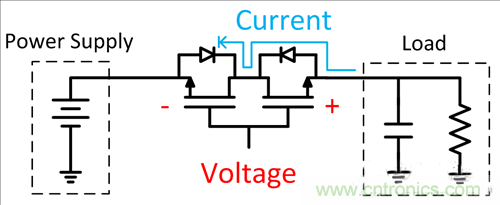 為了在FET關(guān)閉時阻斷兩個方向上的電流,你還可以將FET背靠背連接。與二極管解決方案相比,電源到負(fù)載的壓降更低,不過這種實現(xiàn)方式占用了大量的電路板面積。圖3顯示了用來阻斷反向電流的背靠背FET示例。