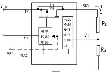 圖2是一種帶過流保護的負載開關結構框圖,圖2中,RL是負載,RS是電流檢測電阻。流過RS的電壓降VRS與電流I成比例,此電壓VRS輸入負載開關VI端。若內(nèi)部電流檢測電路檢測出有過流狀態(tài),輸出過流信號(電平信號)給通、斷控制電路,關斷負載開關。