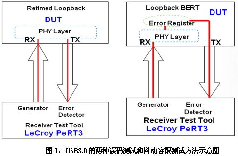 對(duì)于USB3.0的接收機(jī)測試還可以使用另一種方法:即Loopback BERT Method。如下圖1的右圖所示:DUT的接收端工作在Loopback BERT模式,直接分析BERT發(fā)送出的已知的測試碼流,對(duì)接收到的誤碼計(jì)數(shù),誤碼數(shù)量存入誤碼寄存器(如下圖1的Error Register),LeCroy PeRT3直接讀取誤碼寄存器,得到誤碼率和抖動(dòng)容限測試結(jié)果。