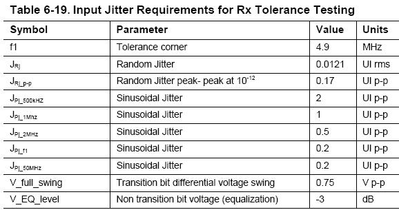 在接收機(jī)測試中,碼型發(fā)生器和待測試芯片的擴(kuò)頻時(shí)鐘功能(SSC)都打開,輸出信號(hào)的特征需滿足下圖3所示:信號(hào)的峰峰值大于750毫伏,-3dB的去加重,隨機(jī)抖動(dòng)的RMS值為0.0121UI(Unit Interval的簡稱,即1個(gè)比特的時(shí)間),即0.0121*200ps = 2.42ps,添加的正弦抖動(dòng)的頻率為500kHz、1MHz、2MHz、4.9MHz、50MHz,其對(duì)應(yīng)的抖動(dòng)峰峰值為2UI、1UI、0.5UI、0.2UI、0.2UI。要求在添加了上述數(shù)量的隨機(jī)抖動(dòng)和正弦抖動(dòng)后誤碼率小于 。其中,頻率低于500KHz的抖動(dòng)大于2個(gè)比特,說明USB3.0芯片的接收端需具備較強(qiáng)的抖動(dòng)過濾能力,因?yàn)槎鄶?shù)開關(guān)電源工作在這個(gè)頻段。
