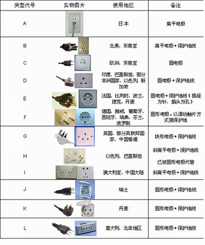 交流電墻壁插座的歷史不過80年,此間隨著用電量、用電經驗與事故教訓的增加,由于技術、安全性、經濟性等因素,加之地理、歷史、政治等原因,世界各地在發(fā)展民用電器供電裝置時,并沒有采用美國最初的插座設計而形成了不同標準,使得墻壁插座形式多種多樣。美國商務部統(tǒng)計了全球常見電源插頭/座(表2.1)樣式,并以字母進行了分類。