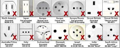 這些插頭/座大多彼此互不兼容,如果再把同一類型中耐壓、功率的差別計入在內,種類就更多了。這種情況顯然造成:即使電器設備供電電壓相同,也無法在不同地區(qū)使用。國際電工委員會(IEC)曾經在1986年和1992年頒布了電源插頭/座的國際標準:針對250V電壓等級的IEC60906-1和針對125V電壓等級的IEC60906-2。其3芯插頭外觀(圖2.1)類似于表2.1中的J型,由于與全球范圍內大多數(shù)插頭/座不兼容(圖2.2),推行受到很大阻力。