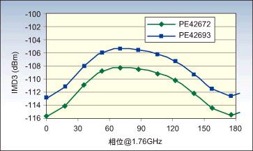圖1:IP3與元件的第三階交調(diào)失真(IMD3)性能有關(guān)。該圖顯示了UltraCMOSSP7T(PE42672)和SP9T(PE42693)的這些相位上指標(biāo)。