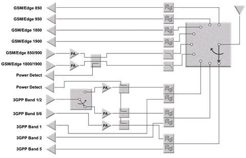 隨著多頻段架構(gòu)的普及,對(duì)功率放大器和相關(guān)濾波器的數(shù)量提出了嚴(yán)格的要求。事實(shí)上,對(duì)功率放大器的技術(shù)要求沒有變化,但手機(jī)設(shè)計(jì)需要使用更多的功率放大器。因此真正改變的,是需要一種高效率方法,將所有射頻信號(hào)傳送給天線──即單片開關(guān)。