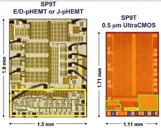 隨著多頻段手機(jī)越來越流行,對(duì)高整合度、小型天線開關(guān)的需求也越來越迫切。UltraCMOSSP7T開關(guān)現(xiàn)在已經(jīng)開始量產(chǎn),SP9T也在2007年底投入量產(chǎn)。在外形方面,GaAsSP7T為1.6x1.5mm,而采用0.5umSOS制程、具有相等或較小和較大信號(hào)性能的相似SP7T開關(guān)設(shè)計(jì)只有1.2x1.0mm,面積縮小了一半。目前已經(jīng)可用的GaAsE/DpHemt或J-pHemtSP9T開關(guān)外形尺寸為1.9x1.5mm。與之相較,采用UltraCMOS0.5um制程制造的SP9T外形尺寸為1.7x1.1mm(圖3),它不需要外部ESD元件和性能增強(qiáng)匹配元件。依照UltraCMOS發(fā)展規(guī)劃,0.25um版本的SP9T尺寸將達(dá)到1.32x1.29mm。
