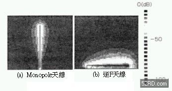 由上式可知如果縮任意小天線大小的話,Pr會(huì)比Pd小導(dǎo)致放射效率大幅降低,這種現(xiàn)象尤其是天線附近的電磁界更加明顯。圖2是提供相同電力給兩種天線時(shí),天線附近的實(shí)際電界分布狀態(tài),圖中的單極(Monopole)天線高度為λ/4(此處λ表示天線頻率的對(duì)應(yīng)波長)屬于中等大小天線,此時(shí)單極天線最大強(qiáng)度大約是-20dB。