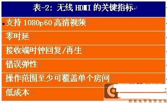 無線HDMI的目標(biāo)是提供與有線HDMI相同的用戶體驗(yàn)。由此我們在表-2中列出無線HDMI的幾項(xiàng)關(guān)鍵指標(biāo):